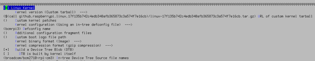 The kernel used is the Raspberry Pi fork of the Linux kernel, as used on the standard Raspbian distribution. In-tree Device Tree Source file names: Set this to only broadcom/bcm2710-rpi-cm3, as we do not need the device tree files for other devices in the Raspberry Pi 3 family.