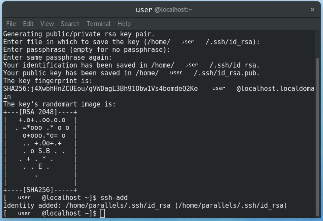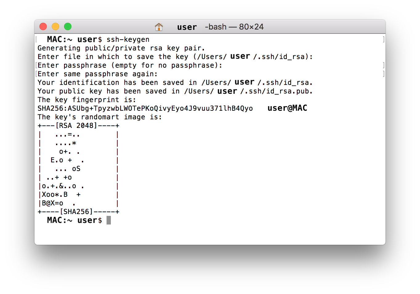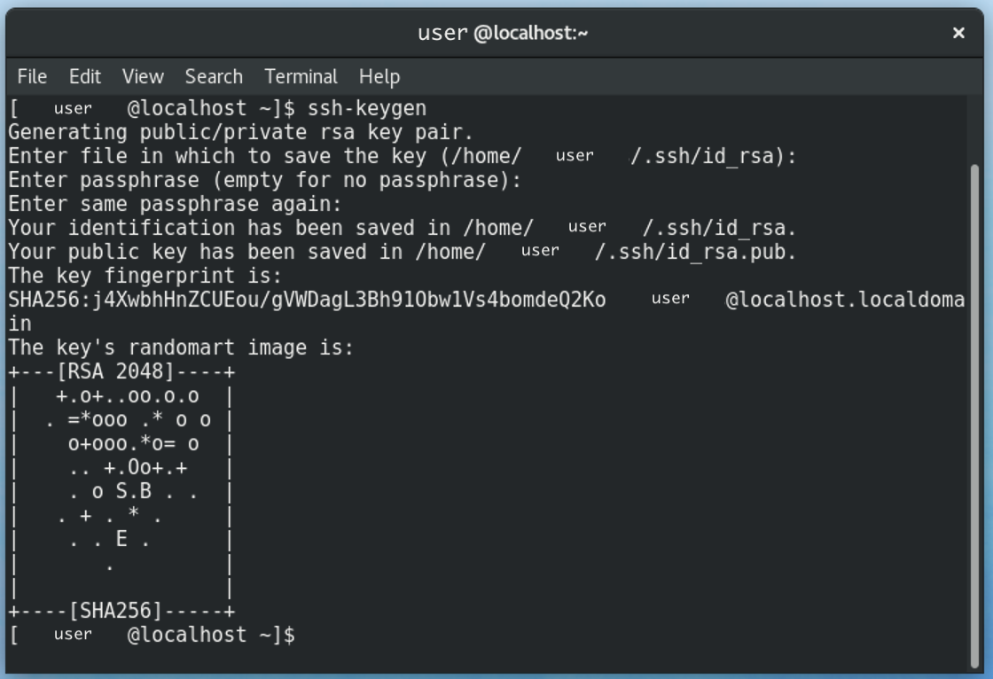 Agree to the default settings for the key generation, and if required, add a passphrase. A pair of SSH keys have now been generated and saved to their default location in your user folder:
