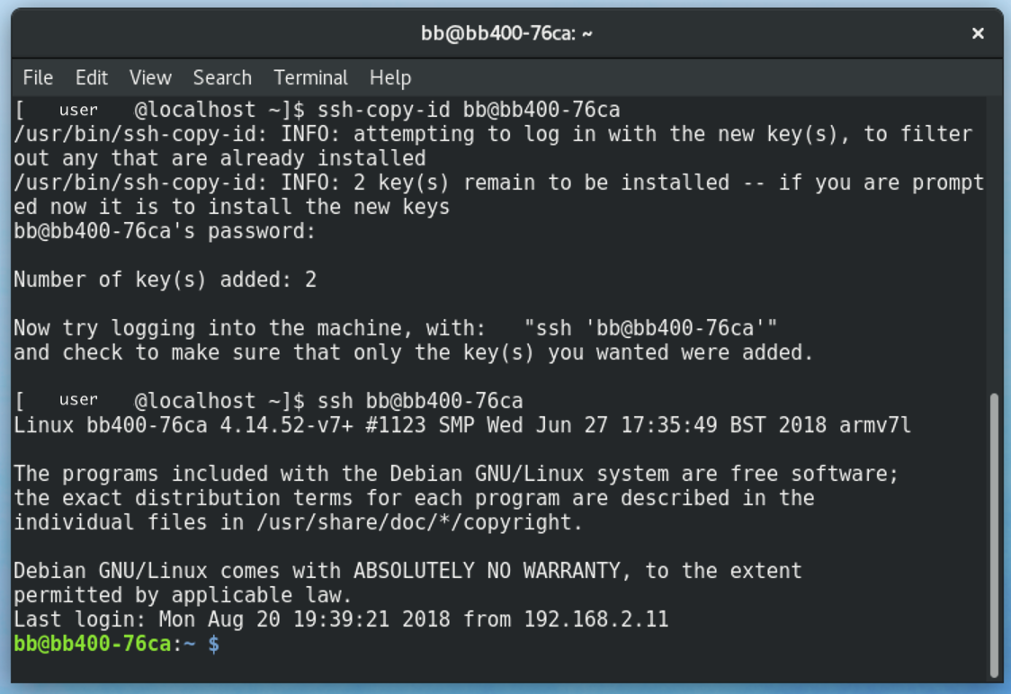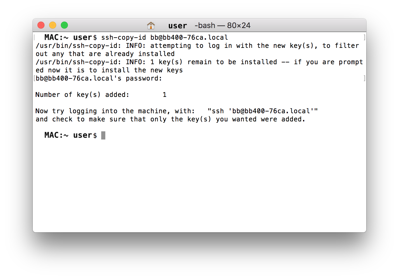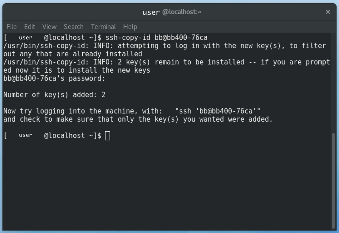 Copy the SSH public key over to the BB-400 by typing into the command line ssh-copy-id bb@bb400-aaaa (Where 'aaaa' represents the last 4 characters of the BB-400 Mac Address found on the back panel). The shell will ask for a password (as the key has not been copied yet).