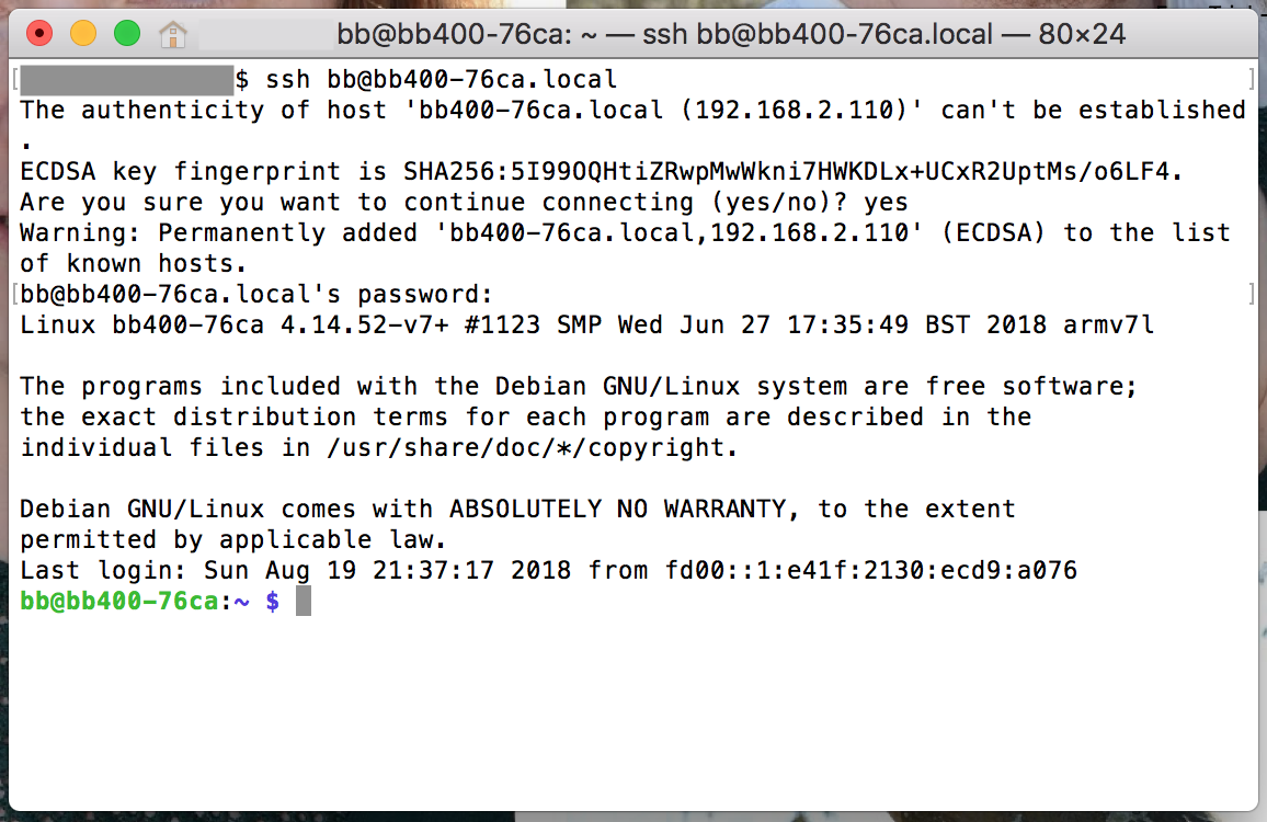 To test the setup type ssh bb@bb400-aaaa to initiate an SSH session with the BB-400: