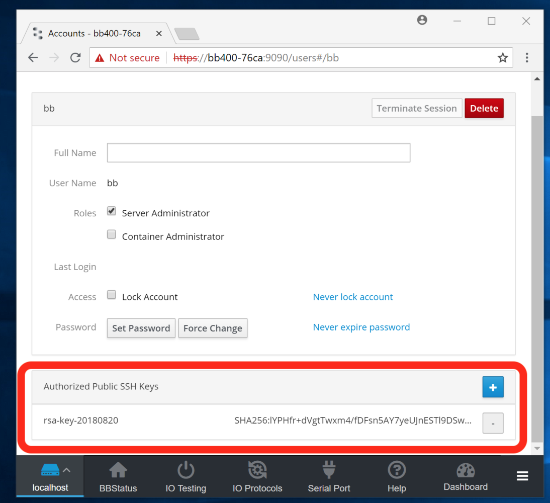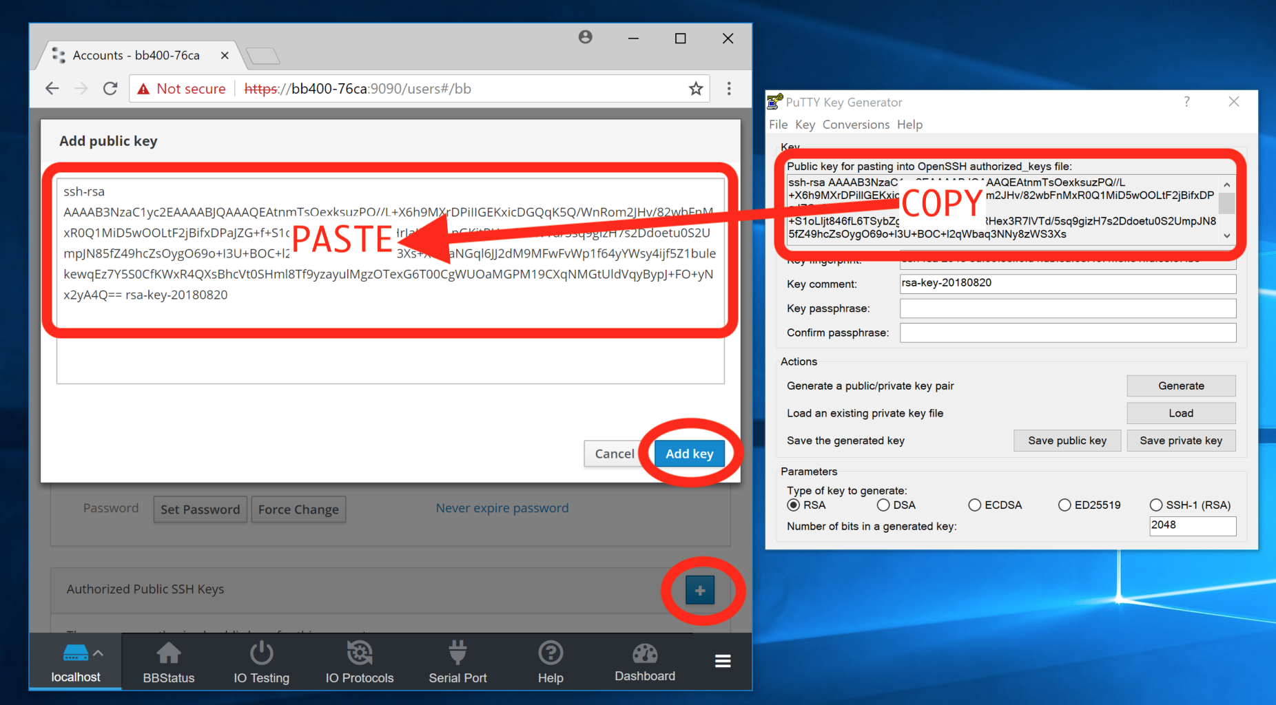 webpage>users>bbwebpage. Click the+button next to Authorized Public SSH Keys. Copy the public key from the highlighted section of PuTTYgen, and paste it into the highlighted section of BB-400 web admin, and clickAdd Key: