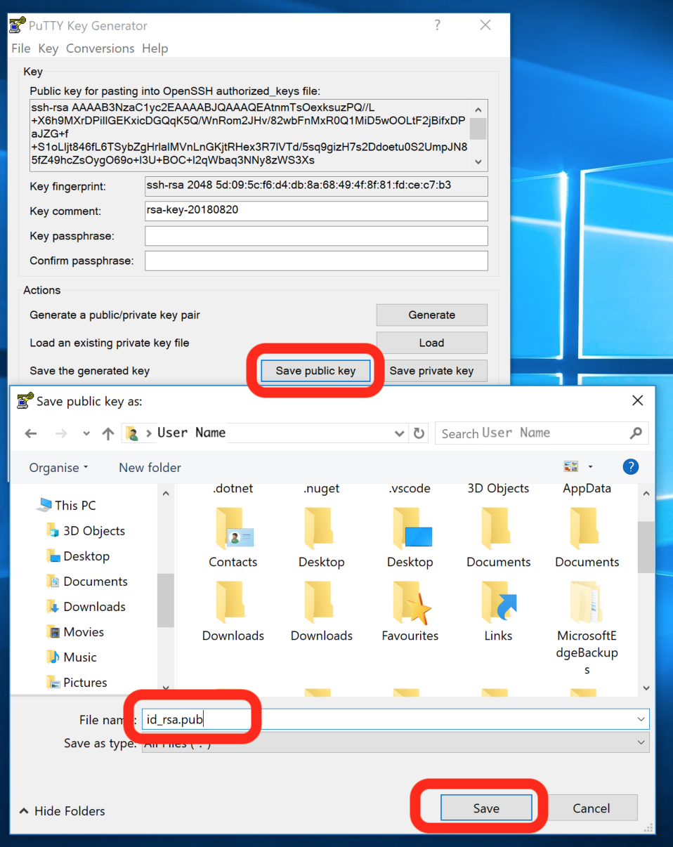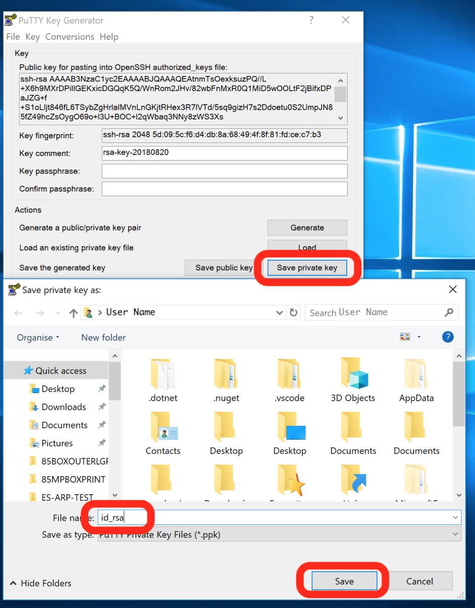 - From PuTTyGen save the public and private key to a local folder on the Windows machine: