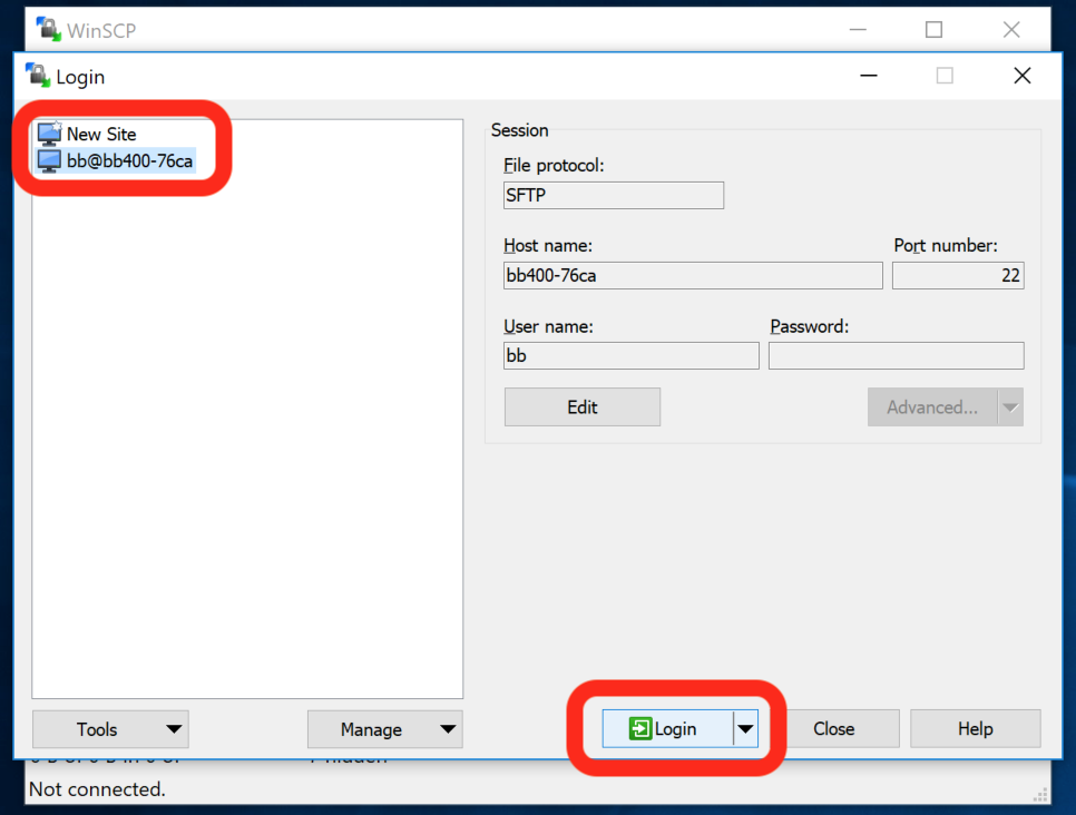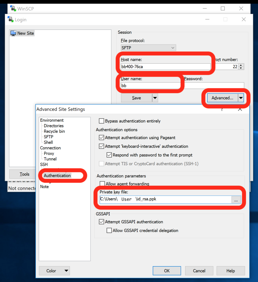 - Exit PuTTYgen. In WinSCP, add the BB-400 hostname and username. Click on