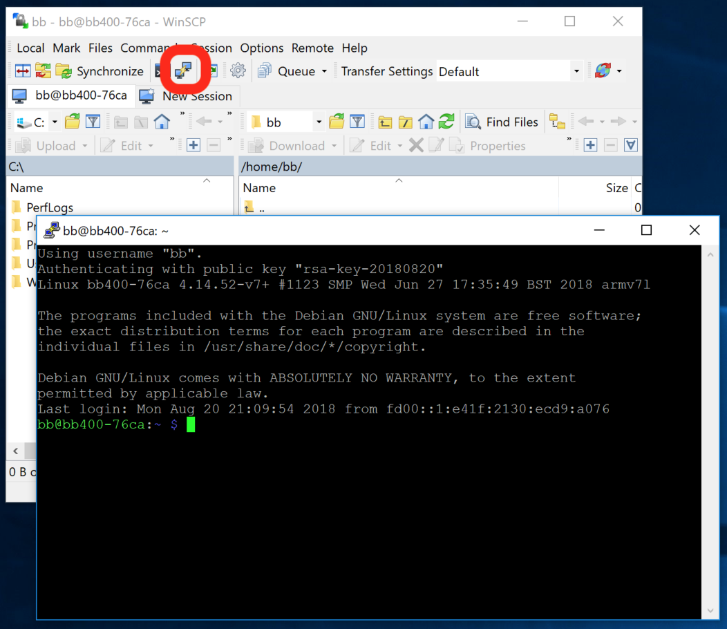 - WinSCP will open the connection to the BB-400, and from there, a terminal can be opened to the command line with PuTTY by clicking on the highlighted icon.