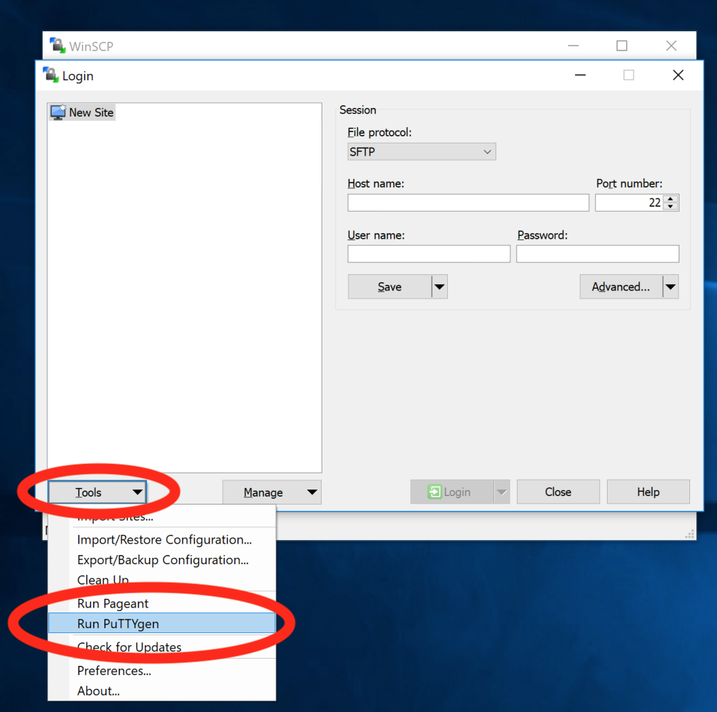 - Open WinSCP from the Windows Start Menu, click Tools and Run PuTTYgen: