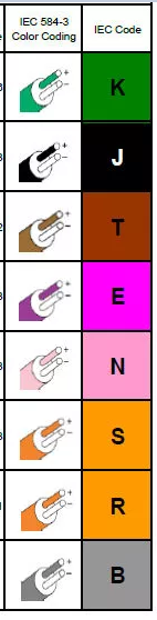 The thermocouple will consist of two wires. This will usually be a white wire (-) and the second wire (+), the colour will depend on the type of thermocouple being used. The ED-593 supports eight different types of thermocouples (K, J, T, E, R, S, B and N). Each type will correspond to a colour (shown in the image below). Which one you use will depend on the range of temperatures you want to measure.