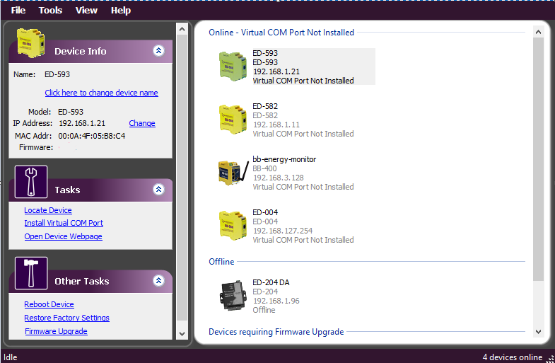 The IP address of the ED device can be found using the Boost.IO manager application, which in turn can be copied to a web browser to access the ED's web page. Opening this application allows you to find your device on the network. Once opened, press F5 or click the find devices button. From here you can view any ED devices that are connected to the network.