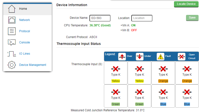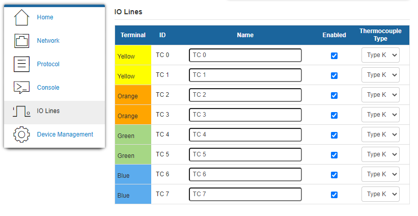 On the ED-593, we can set the thermocouple type on the Thermocouple Inputs page. The ED-593 supports the following thermocouple types K, J, T, E, R, S, B and N.