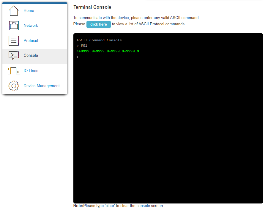 Temperature readings may also be viewed using the ASCII protocol. To access the ASCII protocol on the webpage, from the side menu, select "console". This brings up the terminal console. Type "#01" into the command console and press enter. This will return with the temperature in whichever measurement unit has been selected.