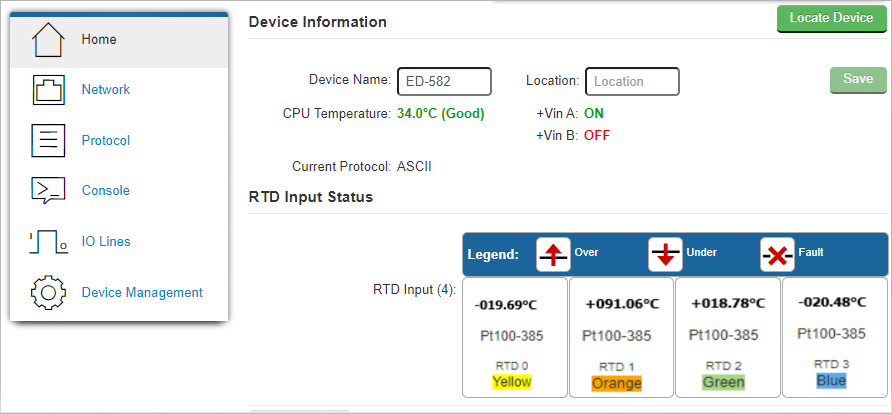Whilst on the webpage and assuming temperatures have been set, the home page will display the temperatures of each RTD or Thermocouple that has been set.