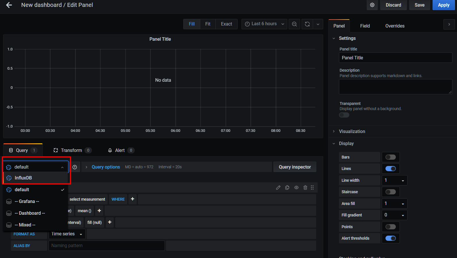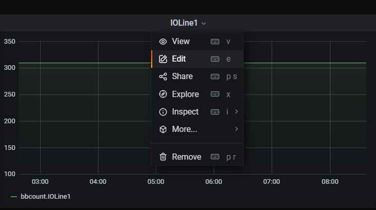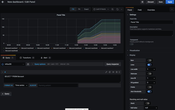 Next we can separate the data into a dashboard for each IO line. Create a new panel for each IO line and change the query to SELECT IOLineNUMBER FROM bbcount, e.g. for IO Line 1 we would use the query: