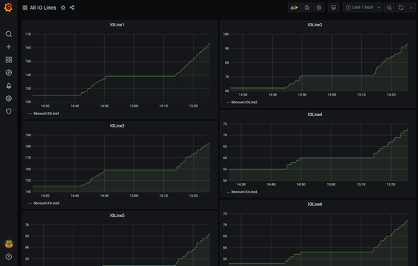 You have successfully followed this example to count the change in BB-400 IO lines, using Node-Red, send the data to InfluxDB and then visualise the changes on Grafana. Now you can adapt the database and the graphs accordingly, or continue to monitor the graphs you have created in this FAQ.