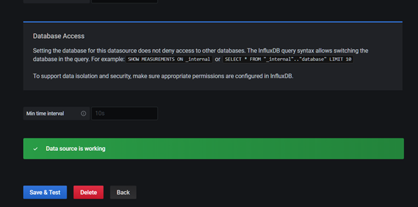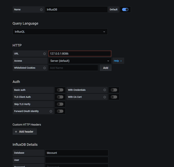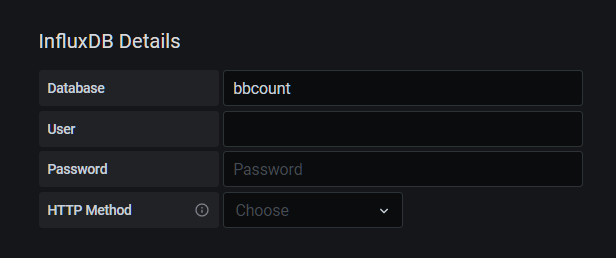 Underneath the InfluxDB Details heading, make sure you add the Database name as "bbcount":