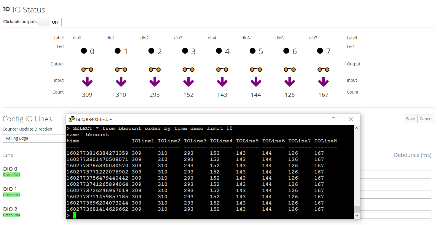 This screenshot shows the counts for each IO line over time. The columns represent the IO line, and each row is a dataset at a given time. Make sure to limit the number of values you output (e.g. LIMIT 10) otherwise when your database becomes populated with a lot of data it can take a while to load.