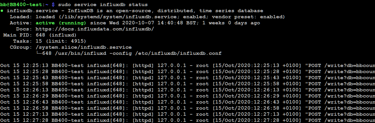 The command in the previous section should have installed InfluxDB onto your device.To check the status of InfluxDB run the following command: