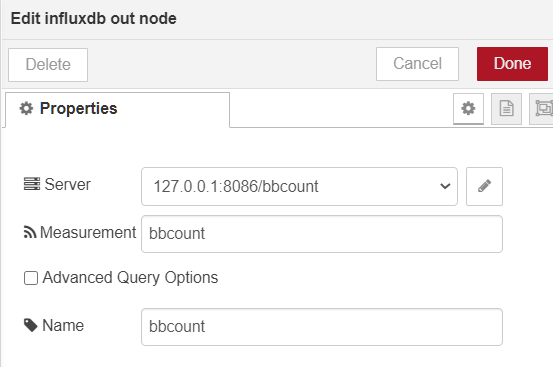You can see the InfluxDB node is titled 'bbcount'. This is the name of the database we will create in InfluxDB. If you would like to give your database a different name, then make sure you update the server URL by editing this node: